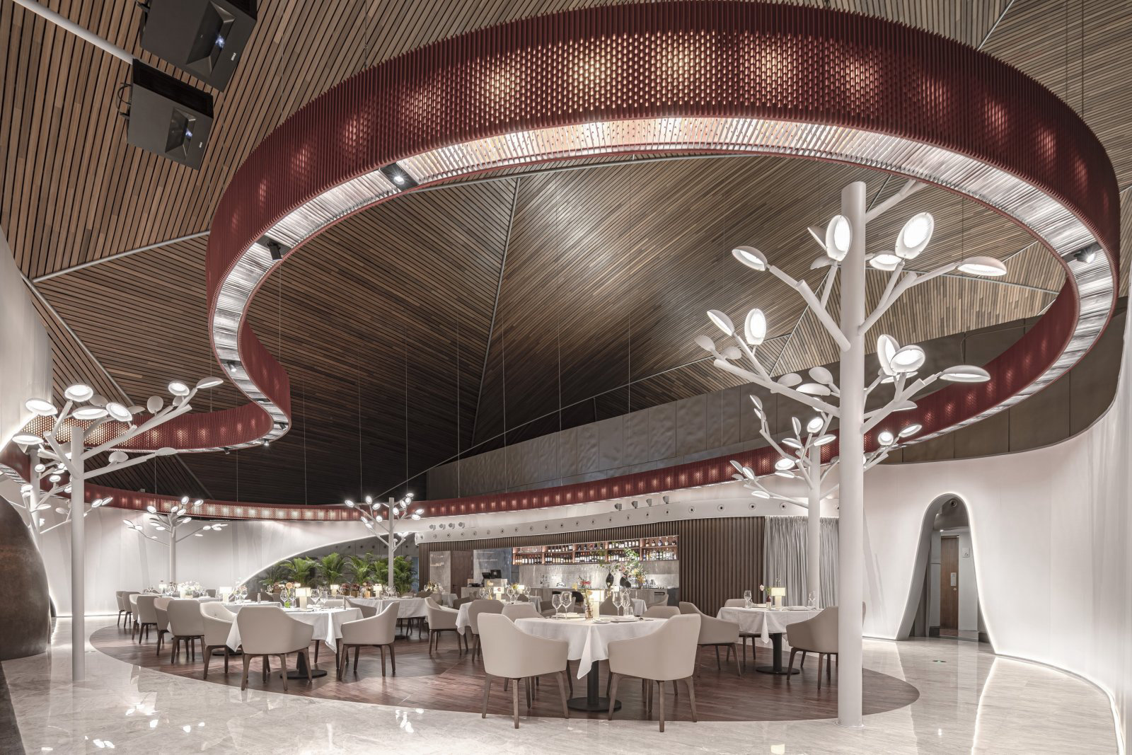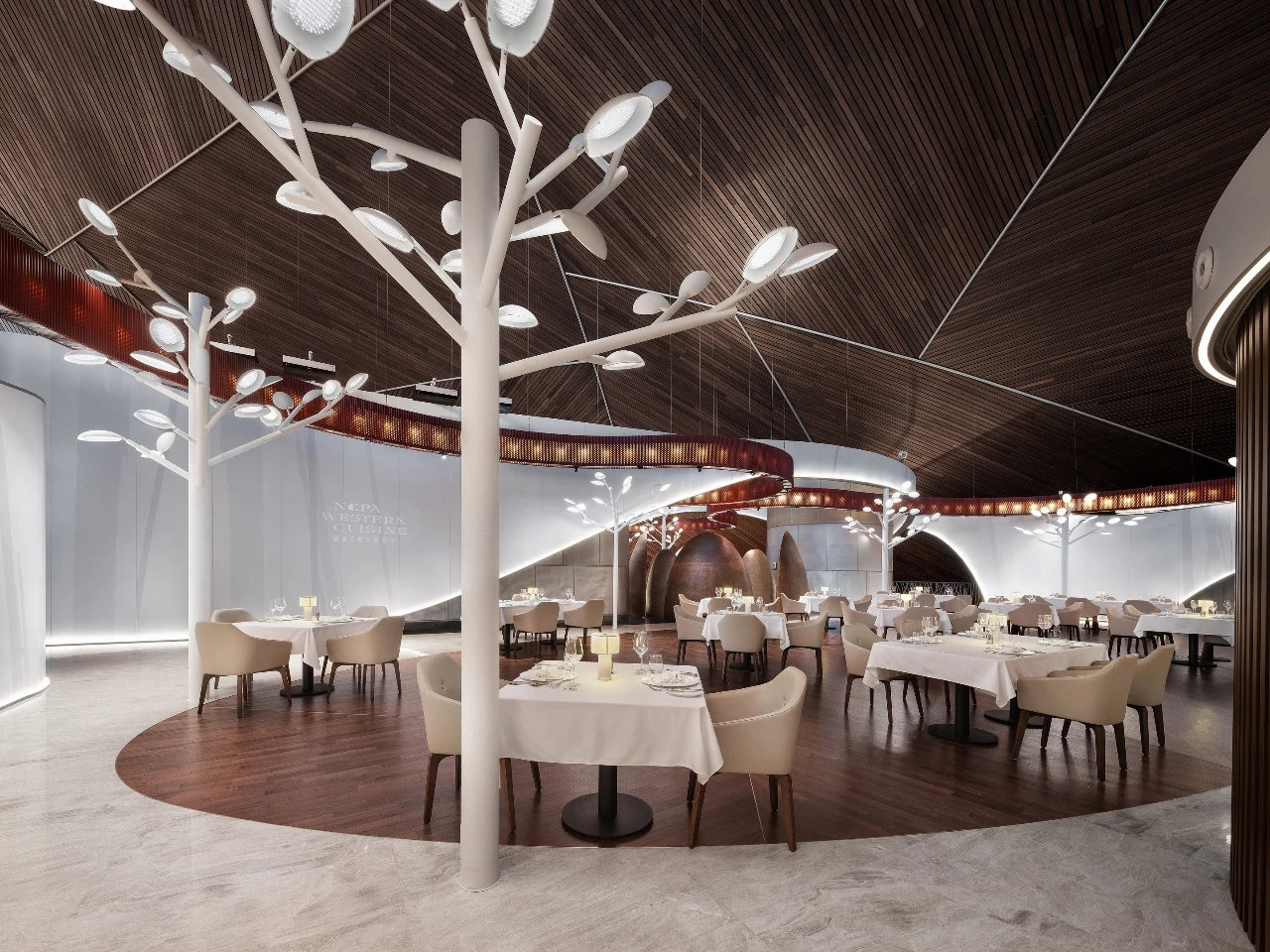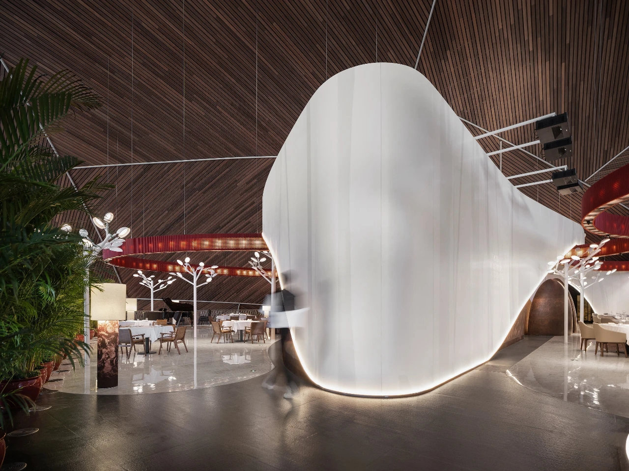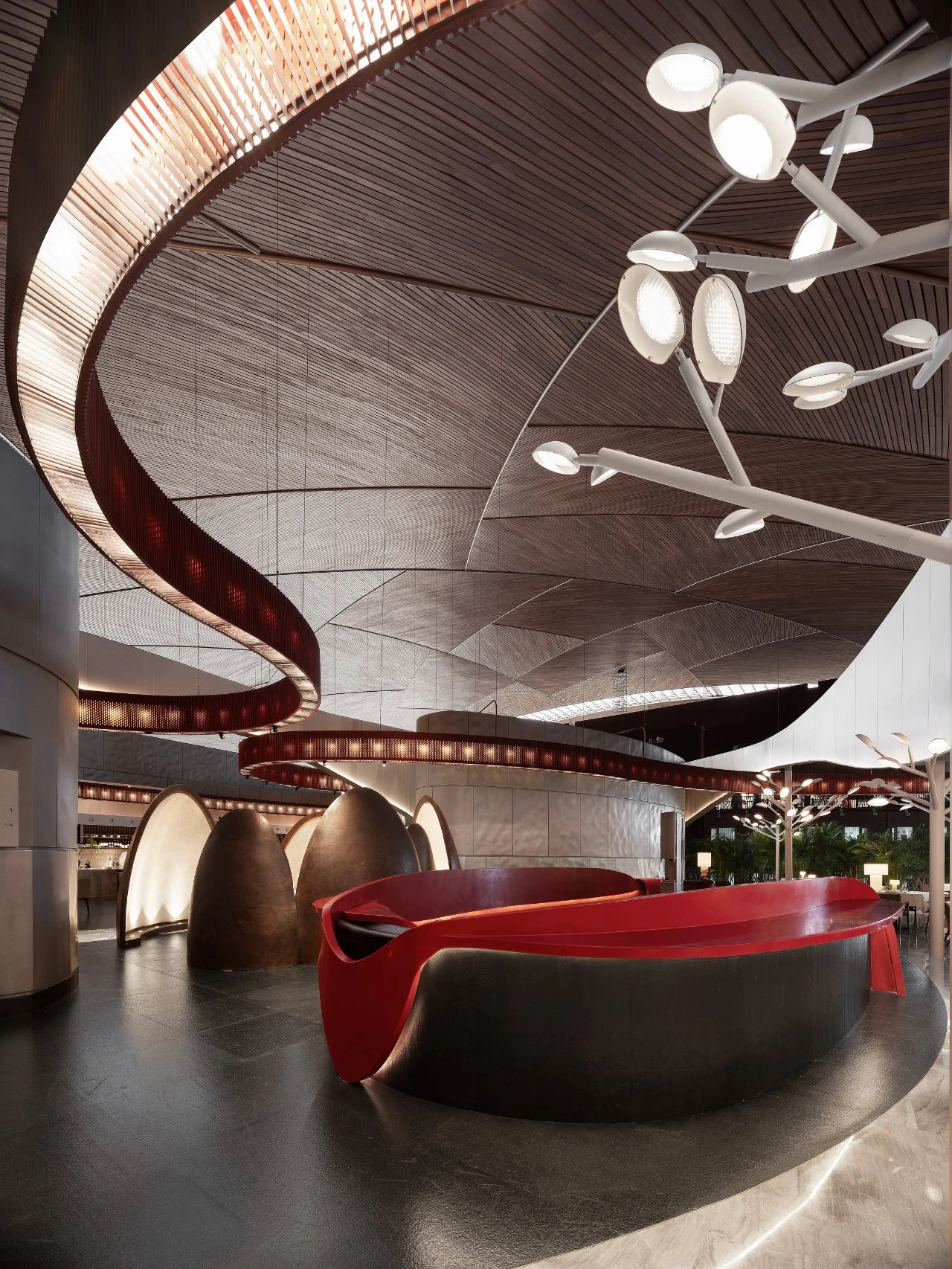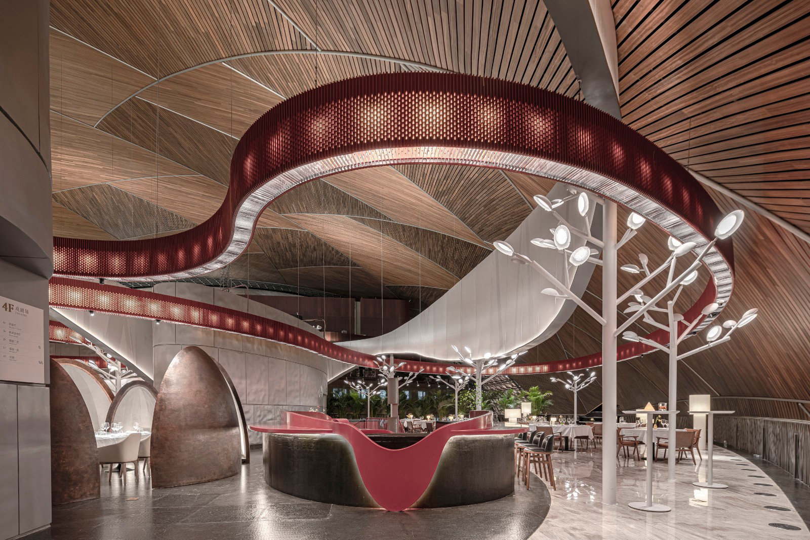 ? ? ? ?作為中國最高藝術殿堂的國家大劇院,上演著大大小小不同類別的演出,來自舞蹈藝術提煉而成的”飄帶”作為給予空間新的視覺元素。就像是一縷絲帶,讓它以自然的型態飄落在空間當中,曲線的飄帶更像是個裝置藝術品,不僅和建筑曲面拱頂形成呼應,也和建筑原有的龍燈融為一體,既能起到空間分隔功能的作用,又能豐富室內空間的層次。