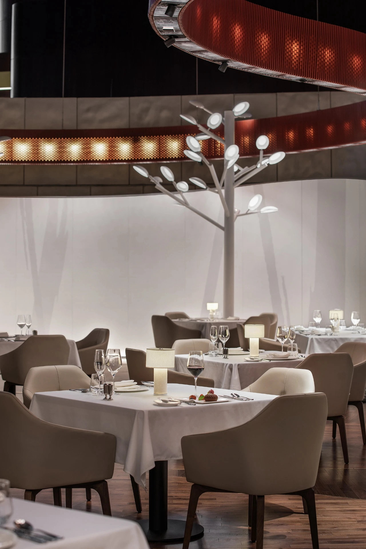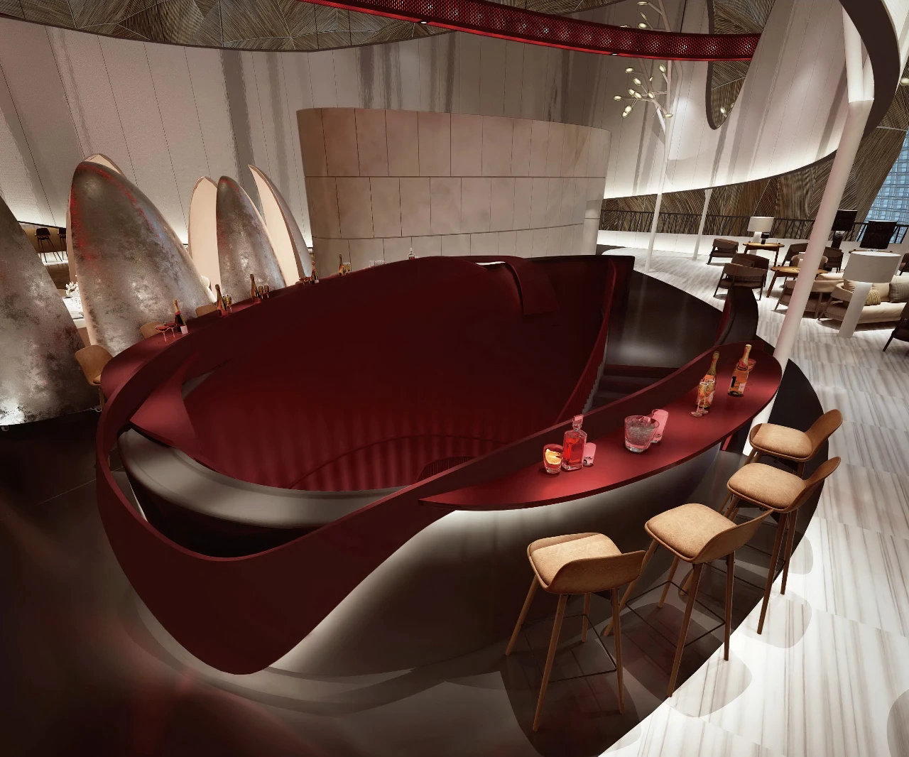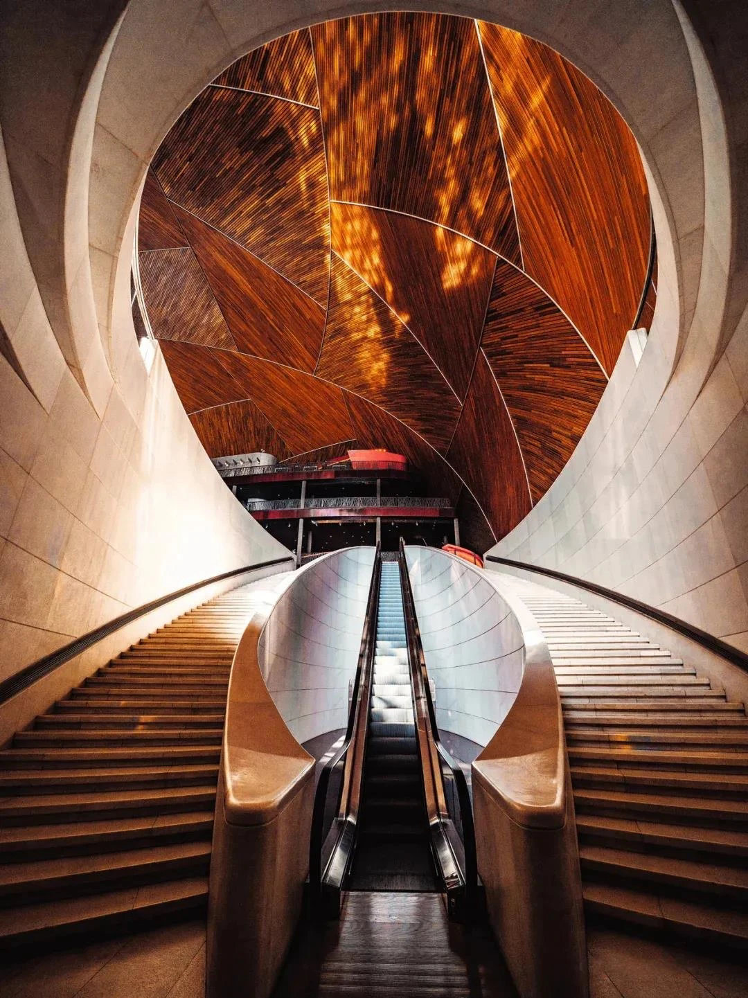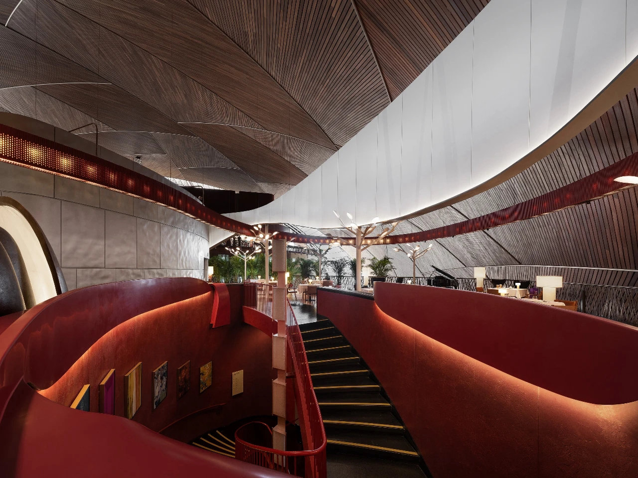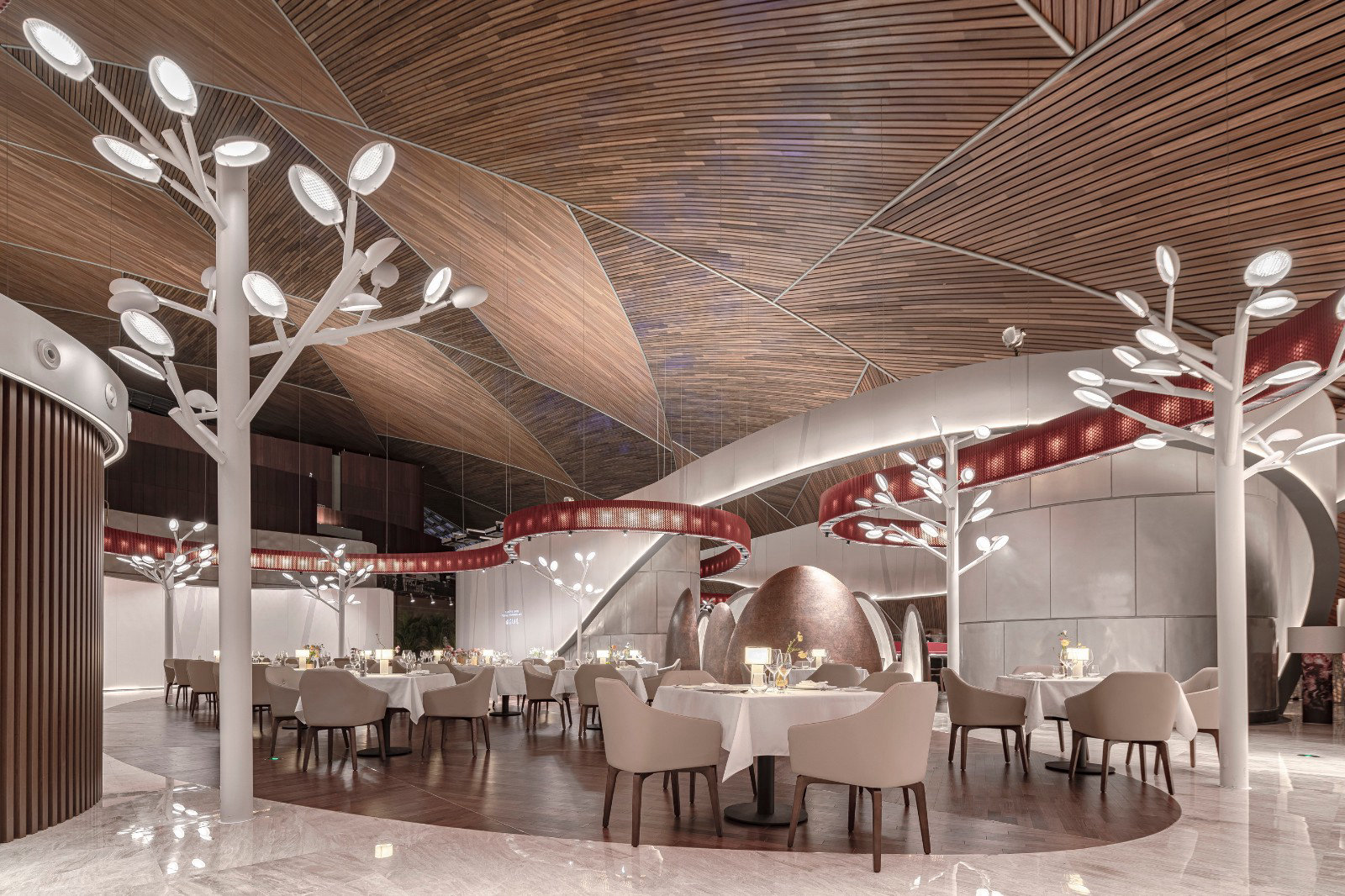 ? ? ? ?作為中國最高藝術殿堂的國家大劇院,上演著大大小小不同類別的演出,來自舞蹈藝術提煉而成的”飄帶”作為給予空間新的視覺元素。就像是一縷絲帶,讓它以自然的型態飄落在空間當中,曲線的飄帶更像是個裝置藝術品,不僅和建筑曲面拱頂形成呼應,也和建筑原有的龍燈融為一體,既能起到空間分隔功能的作用,又能豐富室內空間的層次。
