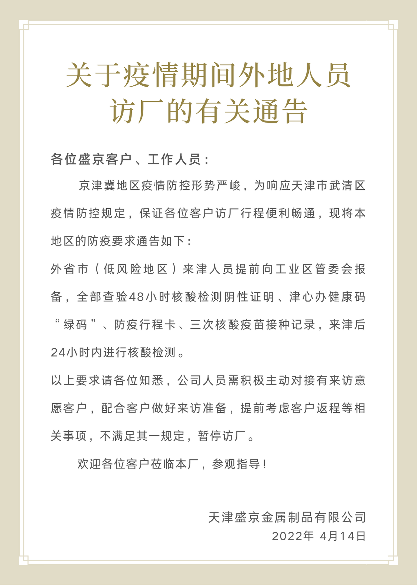 ? ???京津冀地區疫情防控形勢嚴峻,為響應天津市武清區疫情防控規定,保證各位客戶訪廠行程便利暢通,現將本地區的防疫要求通告如下: